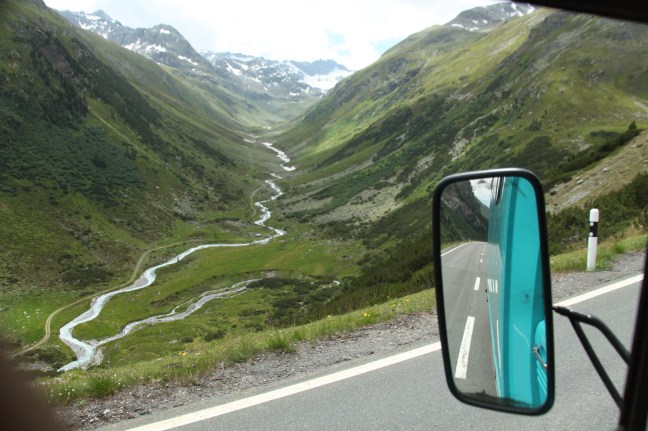 When we hit the Road Again, Matthieu, my truck and I and crossed the beautiful mountain of the “fluela pass” between Zernes and Davos, we didn’t expect such a huge Mountain. When we started to go on it, I felt amazed from the beautiful landscape, the light and the cold air and burning sun combination, but also I wasn’t so peaceful with the fact that my beautiful Oldtimer truck would have to face such a big hill. So after 2 km, we realised that the Truck wouldn’t be faster that 20kmh Up-hill, and every since and then we could see a lot of cars parking left and right from the road with opened bonnet, overcooked engine, with the desperate faces of their owners, waiting for the car towing to help them out.. I wished it wouldn’t happen to me, and lucky us, the brave camion sauna made it !!! And I promised that I would not do it again.. By the way it’s the first time I’ve been overtook by a bicycle because I’m too slow 🙂